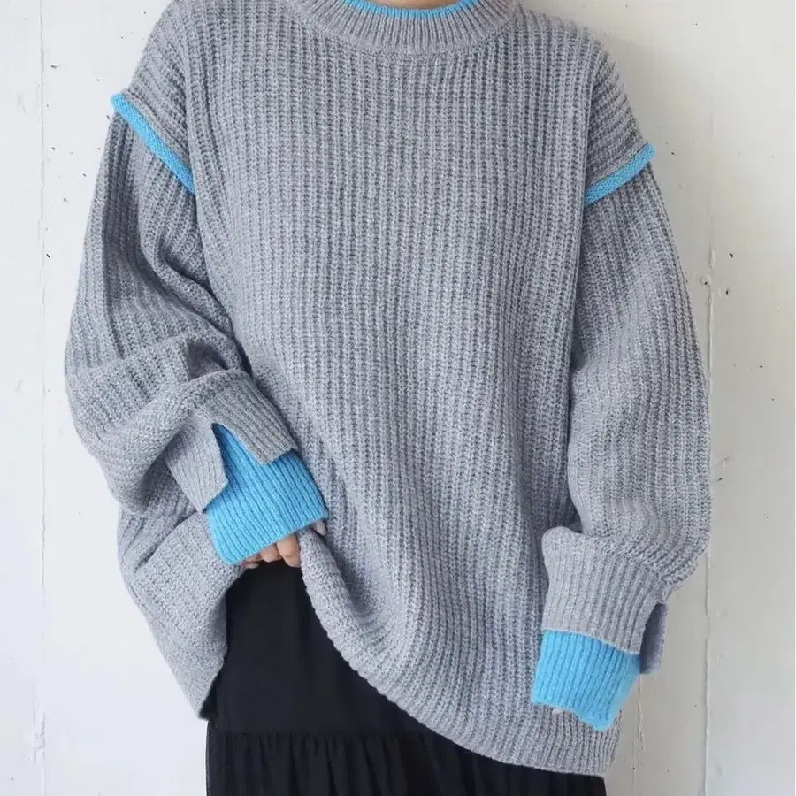 배색 절개가 눈길을 끄는 니트 풀오버입니다.