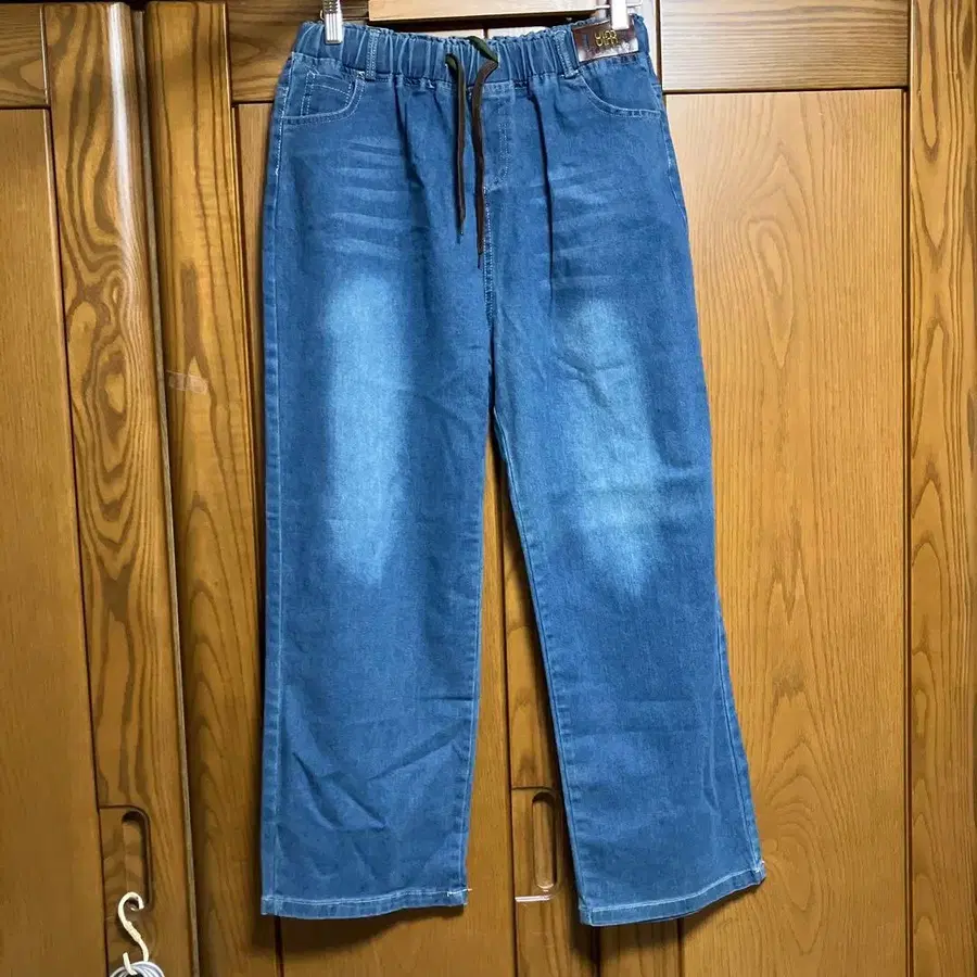 허리밴딩과 드로우 스트링이 있는 데님 팬츠.