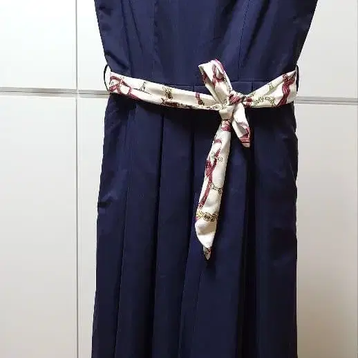 네이비 슬리브리스 원피스, 스카프 디자인의 허리 벨트 포함. - 색상: 네이비 - 디자인: 슬리브리스 - 허리 벨트: 스카프 디자인 - 넥라인: V넥 - 스커트 스타일: 플리츠