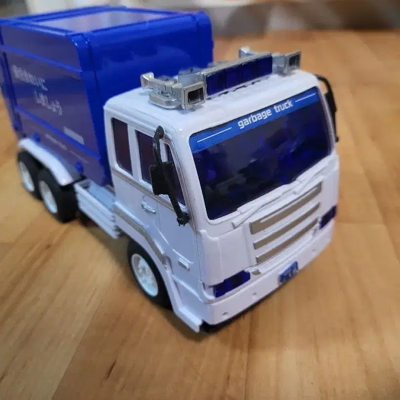 화이트와 파랑색의 쓰레기 수거 자동차, 상차부 개폐 기능 포함.
