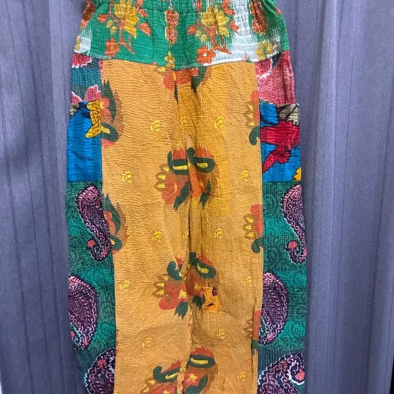 마라이카 구두리 자수 패치워크 디자인의 코튼 캐주얼 팬츠. - 색상: 멀티 컬러 - 소재: 코튼. 빈티지 원단 특성상 색바램이나 얼룩이 있지만 착용에는 문제가 없습니다. - 스타일: 캐주얼 - 허리: 허리밴딩 (끈은 제거되었습니다) - 디자인: 패치워크 - 기장: 롱 기장 정가 1만 5000엔 정도였습니다. 방문해 주셔서 감사합니다. 사이즈 - FREE SIZE 허리 70cm 길이 80cm