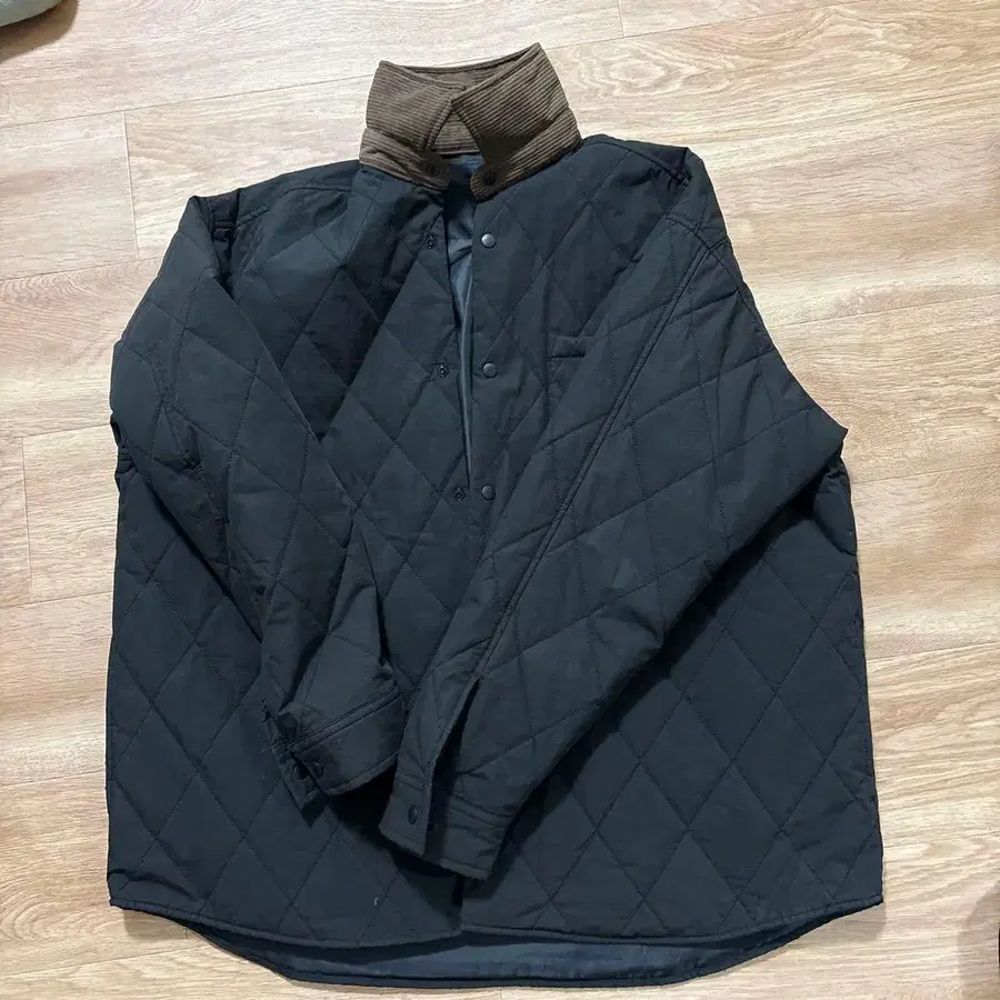 블랙 퀼팅 자켓, 브라운 코듀로이 옷깃 부착, - 브랜드: Clapanic - 사이즈: M - 색상: 블랙 - 디자인: 퀼팅 - 옷깃 디자인: 코듀로이