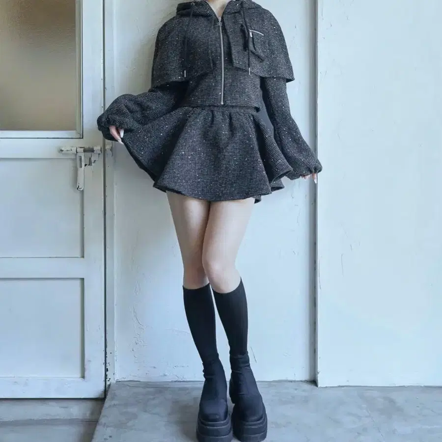 GRL 퍼 후드티 x 미니 스커트 맨투맨 셋업