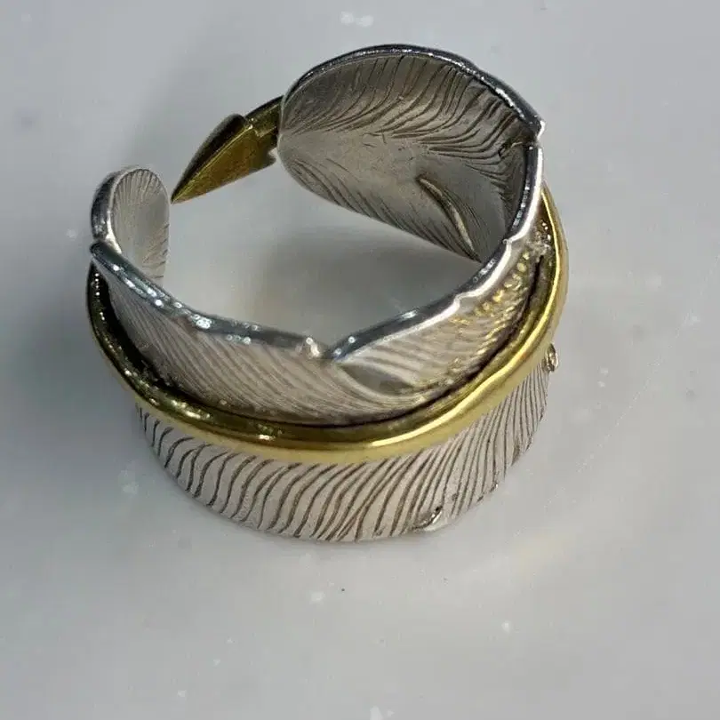 SYMPATHY OF SOUL Arrow Feather Ring Silver x Brass 실버 925와 놋쇠의 골드 컬러가 멋진 애로우 디자인의 페더 반지입니다. 오픈 링으로 사이즈 조절이 가능합니다. 정확한 사이즈는 M 사이즈 (약 13호~약 16호)이지만, 12호~17호 사이에서 조절하여 다양한 손가락에 착용했습니다. 썸링으로 사용하고 싶어 현재는 17호 (폭이 있어 체감상 16호) 정도로 맞춰두었습니다. - 소재: 실버와 골드의 콤비네이션 - 디자인: 깃털 무늬가 새겨진 반지 - 스타일: 오픈 링 - 사이즈: 조절 가능한 사이즈 폭이 있어 임팩트가 있지만, 오픈 링이라 착용감이 답답하지 않고 손가락 움직임이 부드럽습니다. 각인은 silver 외에, SYMPATHY OF SOUL의 3가지 종류의 각인이 안쪽에 있습니다. 깃털 세공의 홈이 음영을 주기 위해 약간의 훈증 가공이 된 것 같지만, 케어제로 닦아 깨끗하게 연마했으므로 상당히 깨끗한 상태라고 생각합니다. 일단 실버 제품이므로 눈에 띄지 않는 정도의 약간의 흠집 등이 있을 수 있으니 양해 부탁드립니다. 부속품은 없으므로 반지 하나만 정성스럽게 포장하여 익명 배송합니다. 아쉬 페 프랑스 H.P.France