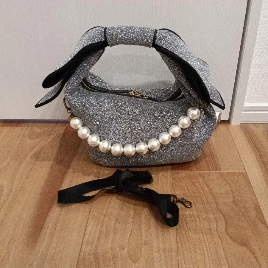 자동 번역되었어요. 원문보기펄 장식과 리본 디자인의 실버 숄더백.