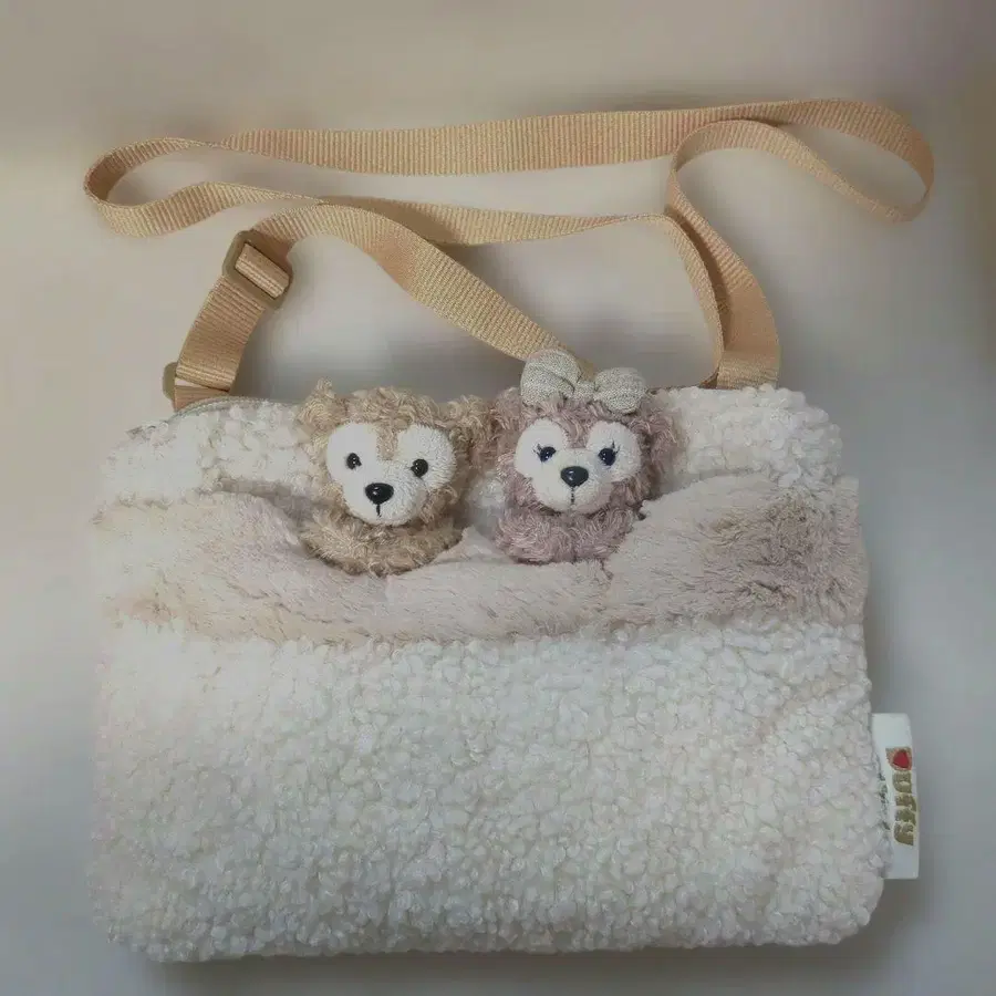 더피와 셰리메이 봉제 인형이 달린, 복슬복슬한 소재의 귀여운 숄더백입니다.