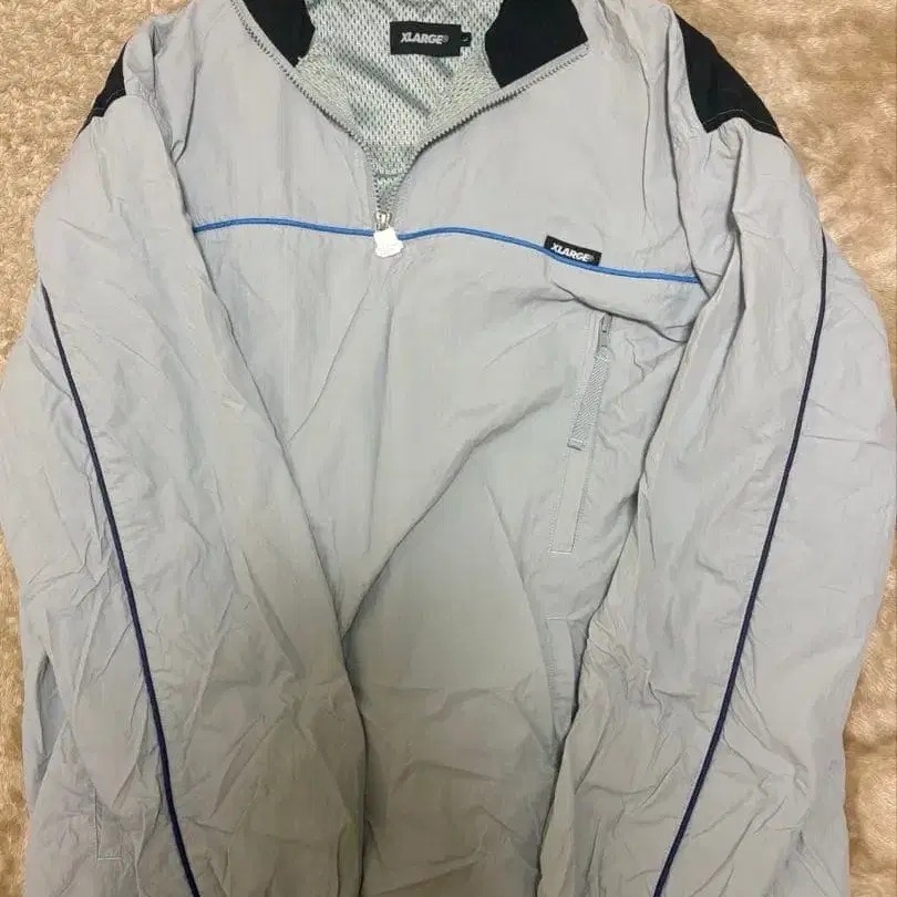 라이트 그레이 색상의 집업 나일론 자켓입니다. 프론트 포켓과 파란색 라인이 특징입니다. - 브랜드: XLARGE - 사이즈: XLARGE - 색상: 라이트 그레이 - 디자인: 집업 - 특징: 프론트 포켓 부착 - 장식: 파란색 라인 부착 바스락거리는 소재 방문해 주셔서 감사합니다.