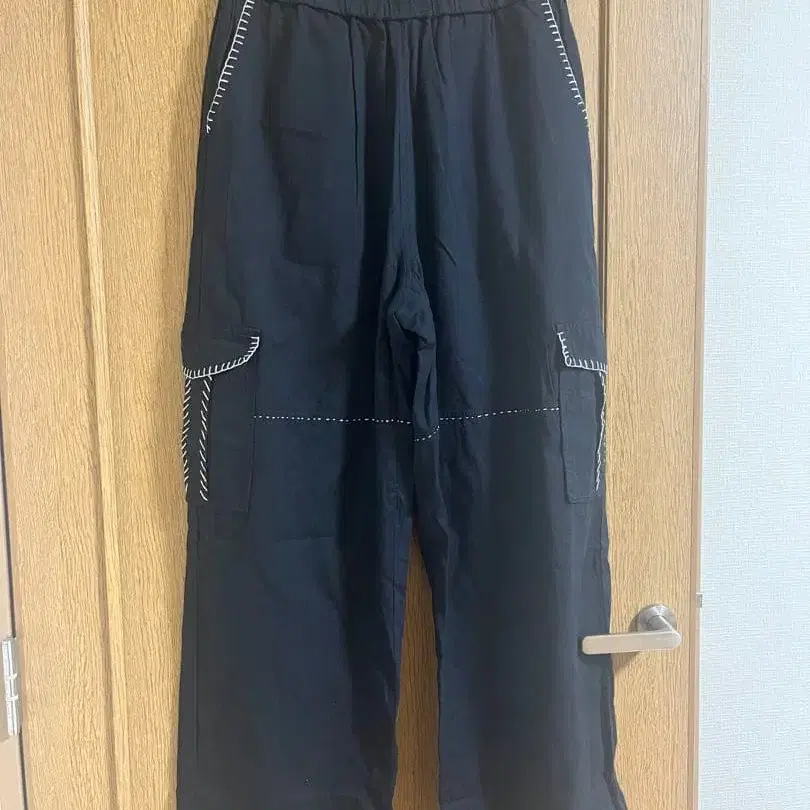 블랙 원단에 화이트 스티치가 악센트를 주고 있습니다. 프리 사이즈로, 밑단 부분에 조절 끈이 달려 있어 잘 고안된 디자인입니다 (사진 4장). 허리에도 원래 조절 끈이 달려 있었으나 분실했습니다. (허리는 밴딩으로 되어 있어 마르신 분이 아니라면 문제 없을 것 같습니다).