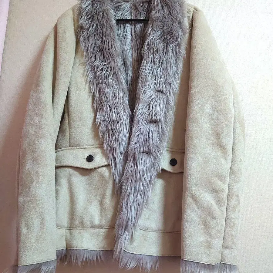 퍼와 스웨이드 소재의 베이지 무스탕 코트, 캐주얼 스타일에 최적입니다.