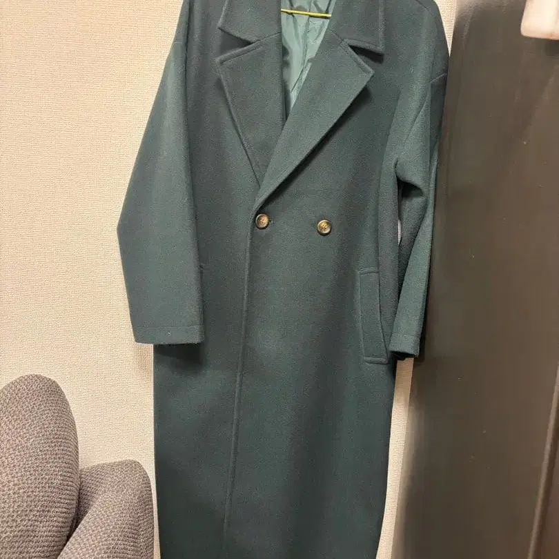 더블 브레스트 다크 그린 롱 코트, 울 혼방 소재에 사이드 슬릿 포함.