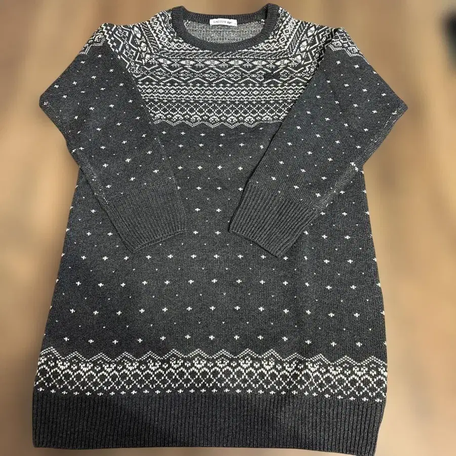 다크 그레이 색상의 노르딕 무늬 니트 원피스, 가슴 부분에 와펜 로고가 있습니다.