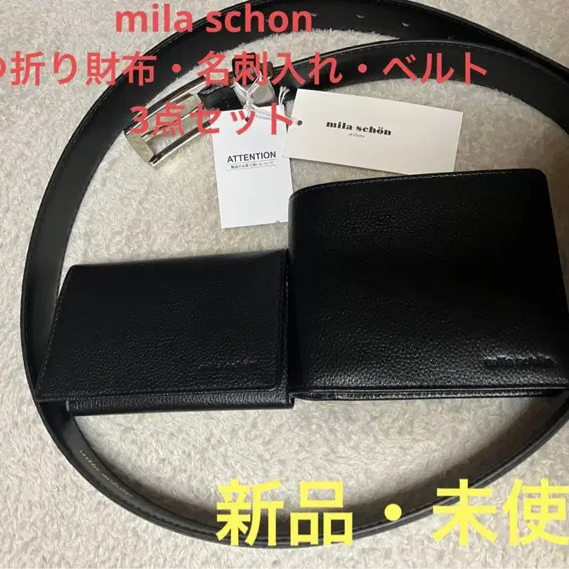 mila schon (밀라 숀) 가죽 소재의 블랙 접이식 지갑과 명함지갑, 벨트 3종 세트입니다. ※ 상자는 없습니다. - 색상: 블랙 - 소재: 가죽 접이식 지갑 - 카드 포켓 수: 4 궁금한 점이 있으시면 문의해 주세요.