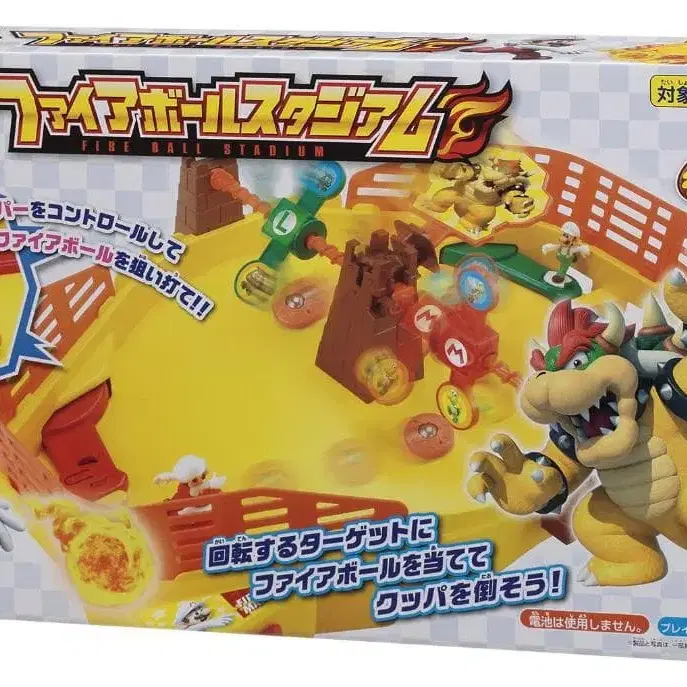 조립이 필요 없습니다: 속도감 있는 대전형 슈팅 액션 게임입니다. 플리퍼로 파이어볼 디스크를 튕겨 빨간색과 그린색의 회전 타겟을 노립니다. 타겟은 파이어볼이 맞으면 회전하면서 중앙에 있는 쿠파 쪽으로 이동합니다. 상대보다 먼저 쿠파 타워까지 타겟을 이동시켜 쿠파를 쓰러뜨린 쪽이 승리합니다. 인형은 링크 시스템 대응으로 별도 판매 상품의 인형과 교환하여 플레이할 수도 있습니다. (C)Nintendo 성별 - 남녀 공용