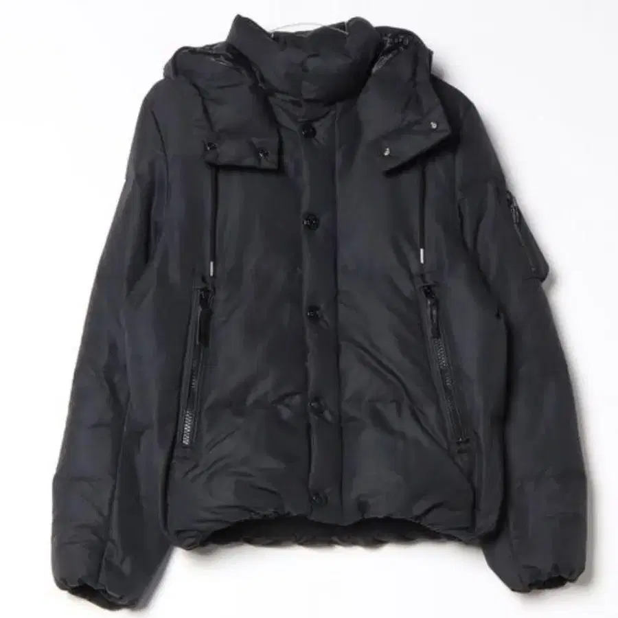 후드 부착 블랙 다운 자켓, 지퍼 포켓 부착으로 기능적입니다.