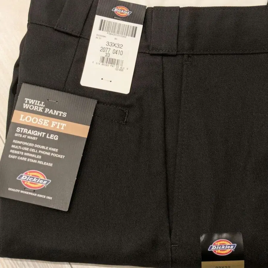 DICKIES 더블니 워크 팬츠 와이드 실루엣 색상은 블랙 상태는 미사용 새상품 사이즈 33 x 32 허리 약 41cm 허벅지 약 31cm 밑위 약 30cm 인심 약 80cm 밑단 폭 약 25cm 약간의 오차는 양해 부탁드립니다. 실루엣 - 와이드 컬러 - 블랙