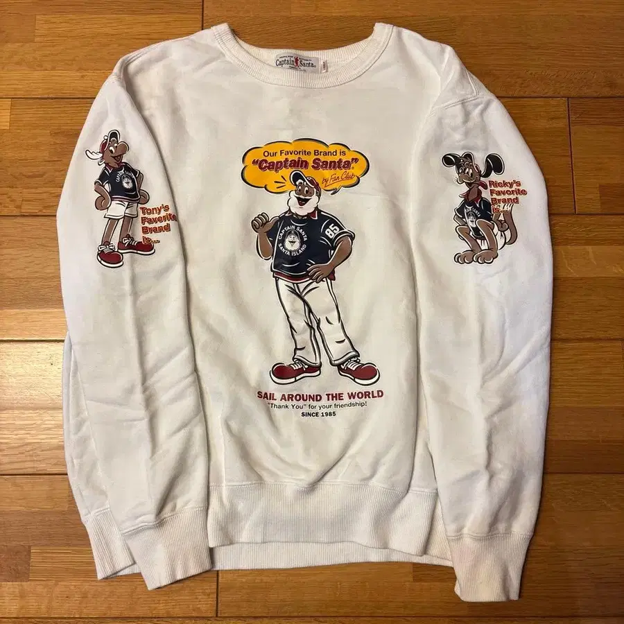 캐릭터 그래픽이 특징인 화이트 맨투맨. - 브랜드: Captain Santa - 디자인: 캐릭터 그래픽 - 색상: 화이트 - 사이즈: L - 메시지: SAIL AROUND THE WORLD 방문해 주셔서 감사합니다.