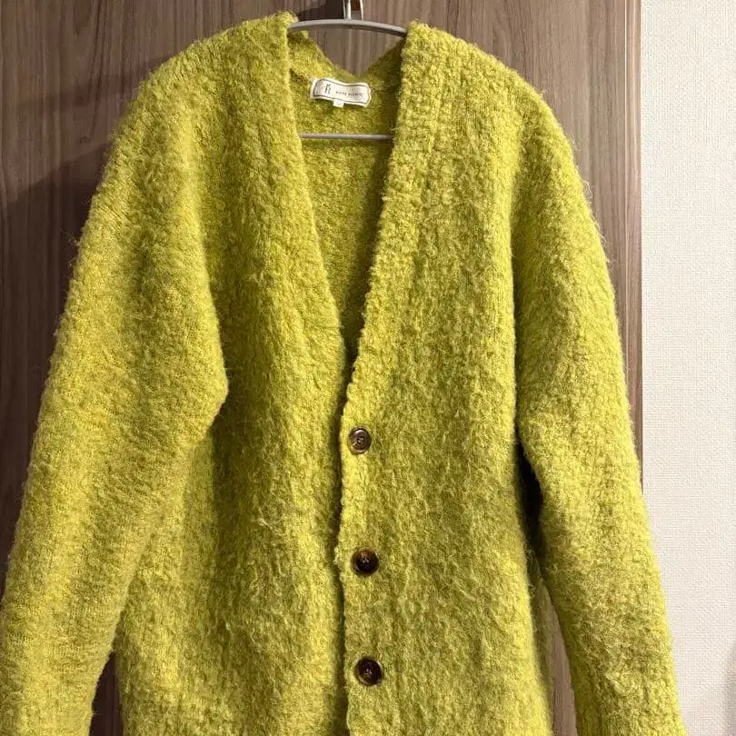 포근하고 볼륨감 있으며 따뜻한 니트 가디건. 가볍고 따뜻한 부클레 소재. 부드럽고 까슬거림 없는 푹신한 원단입니다. 루즈하게 입을 수 있는 넉넉한 박스 실루엣. 구매했지만 한 번도 착용하지 않고 자택 보관했습니다. 4번째 사진이 가장 소재감을 알기 쉬울 것 같습니다. [ 사이즈 ] 표기 사이즈 38 [ 실측치수 ] 어깨 너비 65 가슴 너비 57 소매 길이 46 기장 66 [ 상태 ] 눈에 띄는 상처나 얼룩 없이 깨끗한 상태입니다. [ 색상 ] 라이트 그린