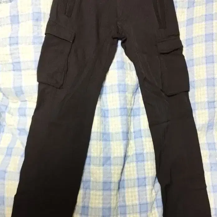 스트레치 소재의 블랙 카고 팬츠, 사이드 포켓이 있어 기능성도 뛰어납니다.