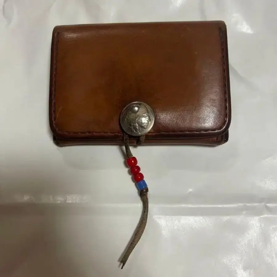 브라운 가죽 소재의 접이식 지갑, 비즈가 달린 끈과 단추식 디자인. 사용감에 대한 사진 등 필요하시면 댓글 남겨주세요. - 색상: 브라운 - 소재: 가죽 - 디자인: 단추식 - 장식: 비즈가 달린 끈 방문해 주셔서 감사합니다.