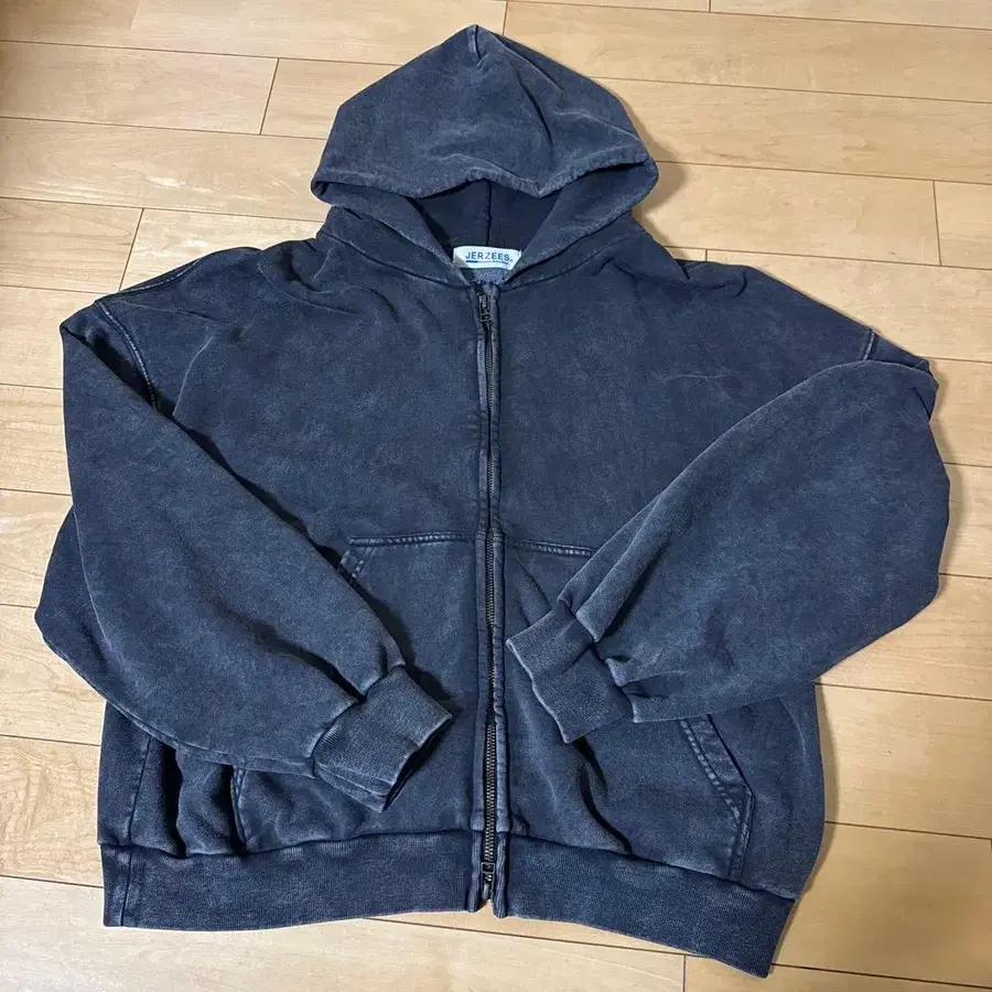 JERZEES의 블랙 후드티 더블 지퍼이며, 빈티지 가공이 되어 있습니다.