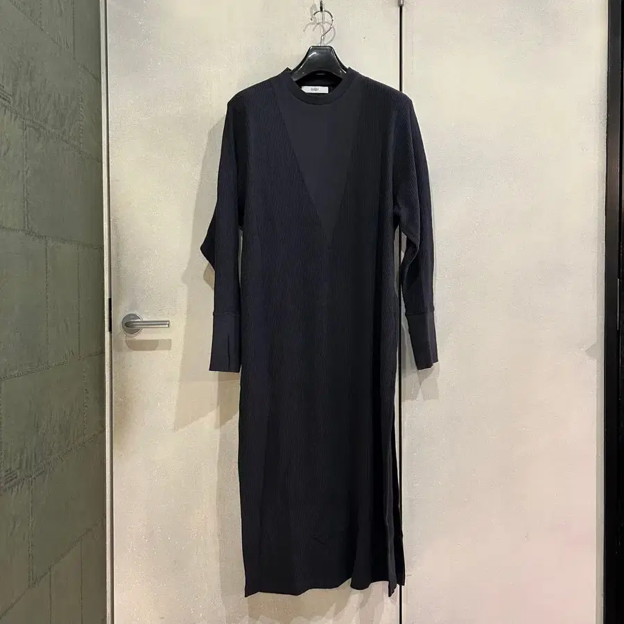 프론트에 디자인이 있는 탁한 네이비 색상의 롱 원피스입니다. 슬릿이 깊게 들어가 있어서 스커트나 팬츠, 레깅스 등을 IN해서 입기 좋습니다~ ♪