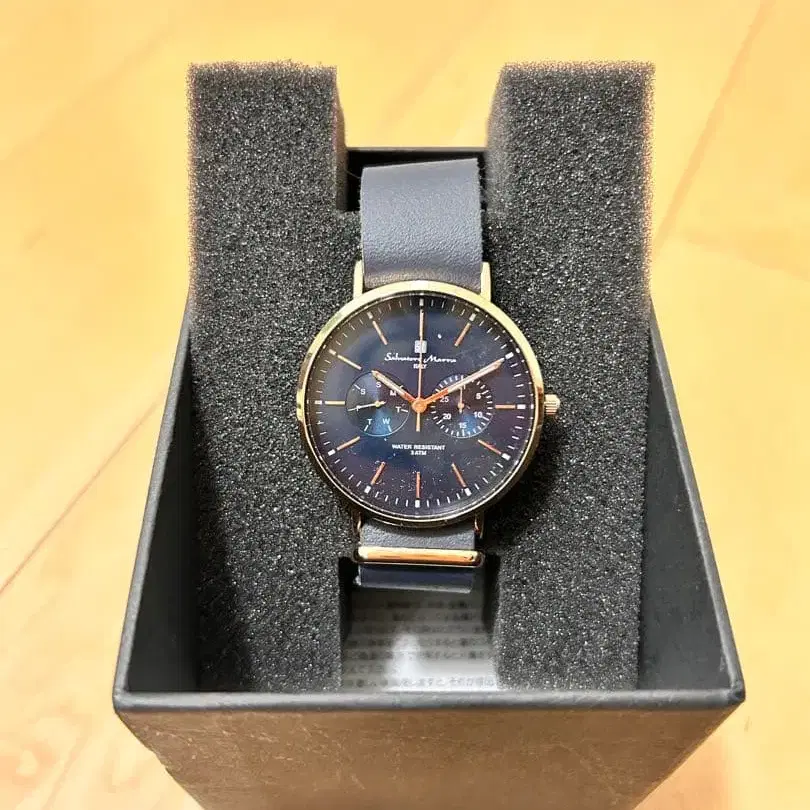 네이비 색상의 다이얼과 가죽 스트랩을 갖춘 크로노그래프 시계입니다. - 브랜드: Salvatore Marra - 색상: 네이비 - 소재: 가죽 - 스타일: 아날로그 - 특징: 크로노그래프 - 부속품: 오리지널 박스 고급스러운 시계입니다! 잘 부탁드립니다!
