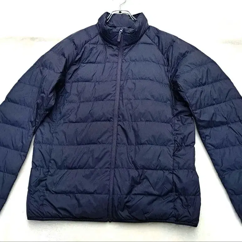 네이비 색상의 퀼팅 다운 자켓입니다. 풀 집업 디자인에 사이드 포켓이 있습니다.