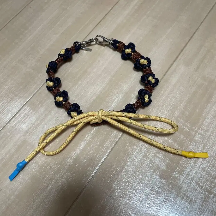 하나하나 수작업으로 엮어 만든 꽃 모티브 스트랩.