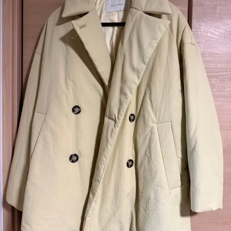 연한 옐로우 컬러의 더블 브레스트 자켓, 앞면에 2개의 포켓 부착.