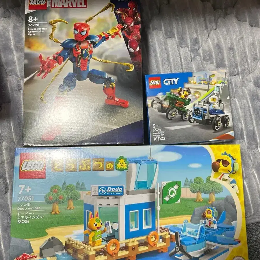 3개 모두 미개봉입니다. 모두 소장하고 있었기 때문에 판매합니다. 레고 마블 스파이더맨 피규어 (76298) 레고 시티 비행기 대 병원 침대 레이스카 팩 (60459) 도도 에어라인즈로 떠나는 하늘 여행 77051 매장에서 판매되던 제품이므로 상자에 흠집 등이 있을 수 있습니다. 양해 부탁드립니다.