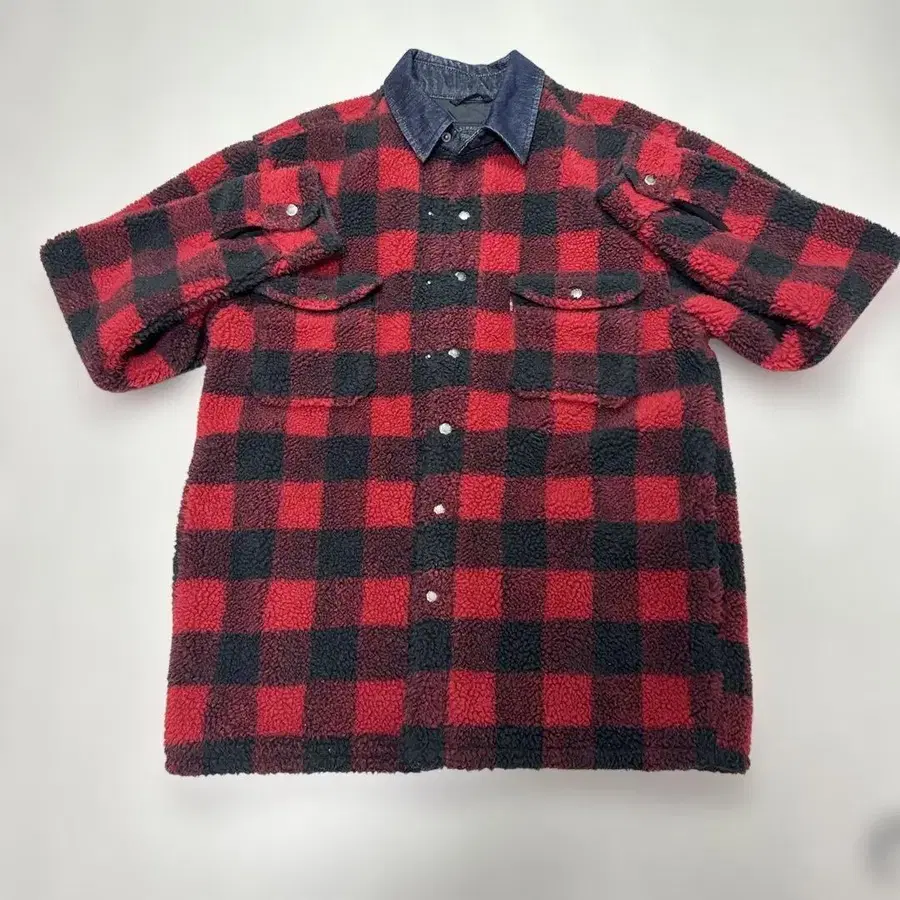 빨간색과 블랙 체크 무늬의 플리스 소재 긴팔 셔츠 자켓입니다. 사이즈는 S라고 되어 있지만, 체감상 M, L 정도 됩니다.