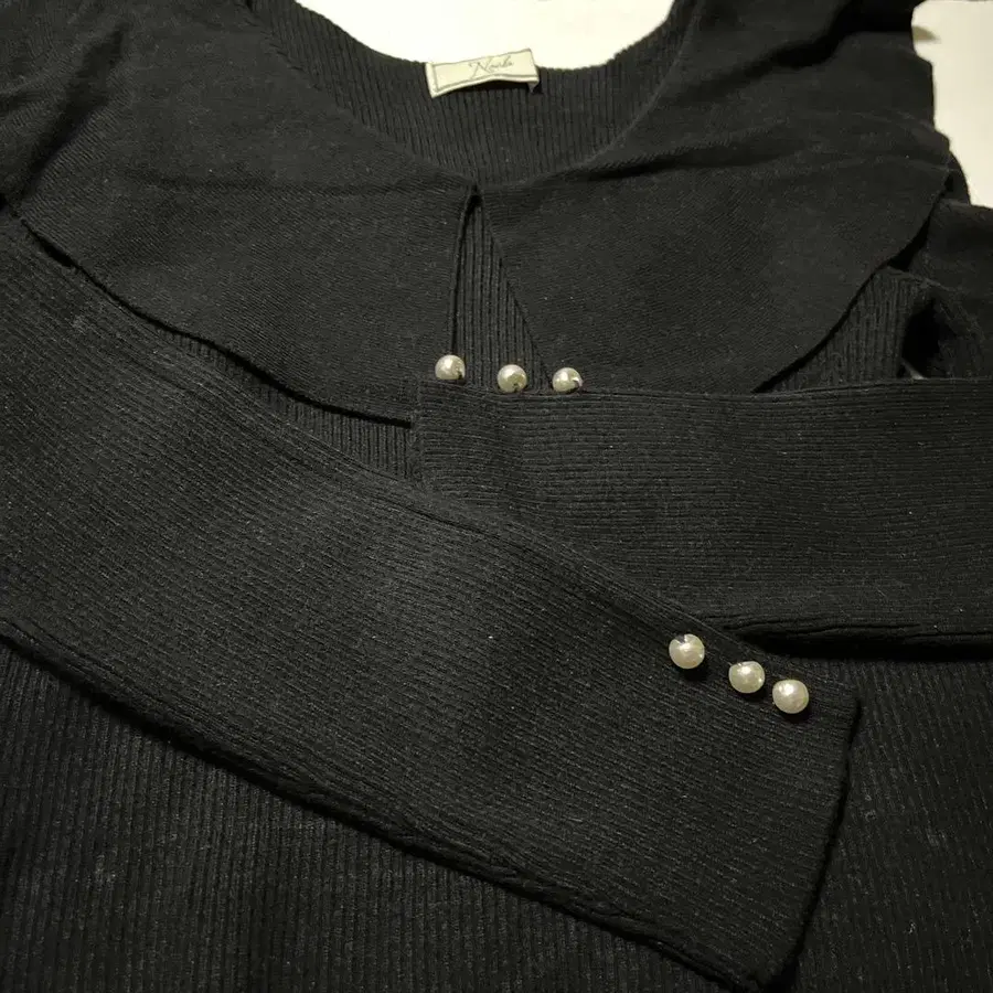 프릴 옷깃과 펄 버튼이 특징인 블랙 니트 스웨터. 사이즈는 어깨 너비 약 30cm, 가슴 폭 약 35cm, 기장 약 43cm로 프리 사이즈이지만 M 정도입니다. - 색상: 블랙 - 디자인: 프릴 옷깃 - 장식: 펄 버튼 - 브랜드: Nadia 방문해 주셔서 감사합니다.