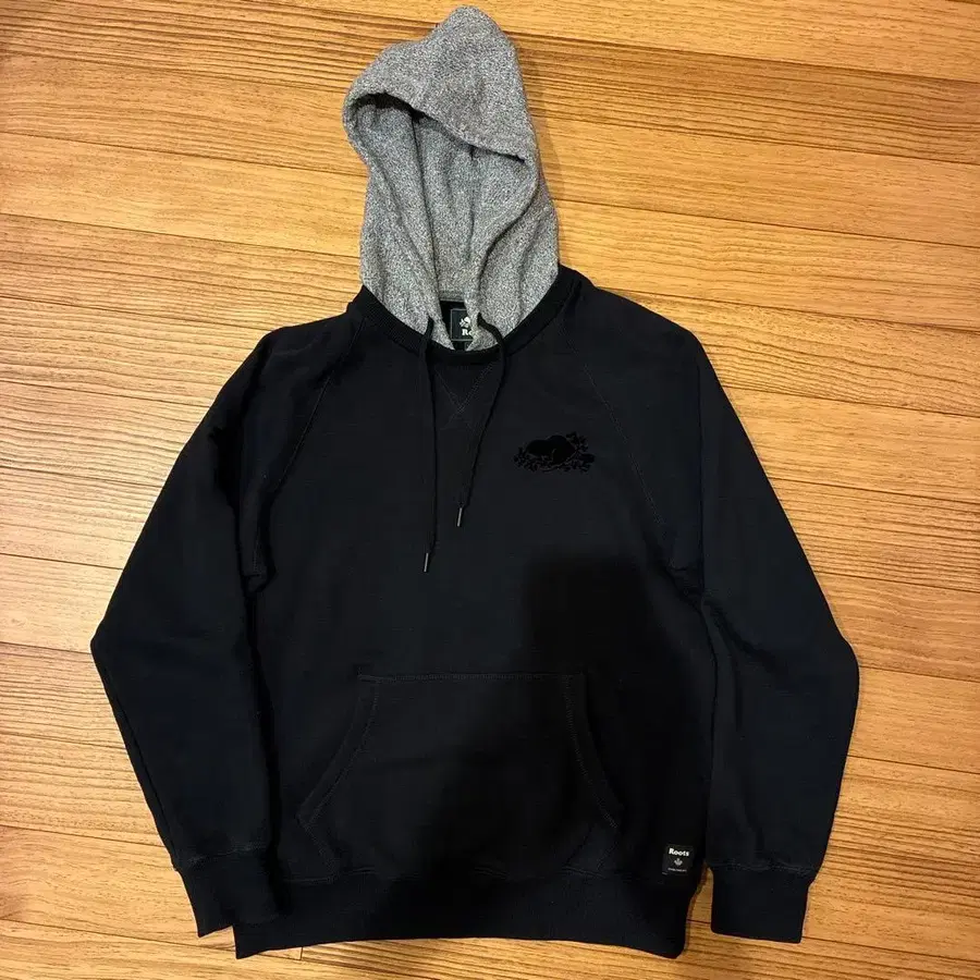 후드 부착형 블랙과 그레이 후드티, 백에 [ Roots ] 로고가 특징입니다.