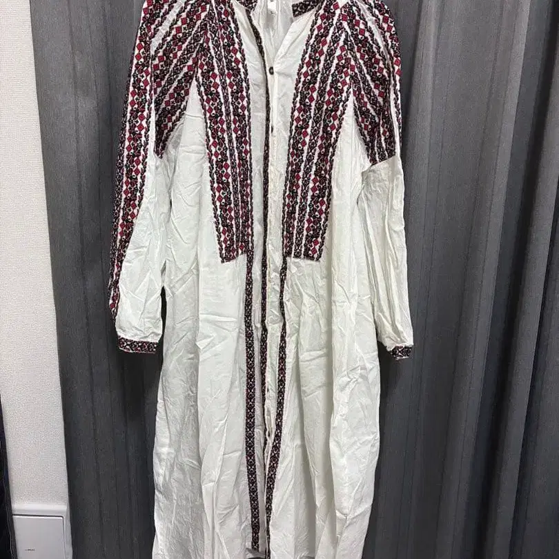 인도 자수 디자인의 화이트 긴팔 셔츠 원피스. - 브랜드: MALAKA - 색상: 화이트 - 디자인: 자수 (기계 자수) - 소매 길이: 긴팔 - 스타일: 셔츠 원피스, 프론트 오픈, 얇은 소재 옷깃 부분이 약간 누렇게 변색되었으나 표백으로 제거 가능한 정도입니다. 이 상태 그대로 발송합니다. 방문해 주셔서 감사합니다. 사이즈 - FREE SIZE 가슴둘레 114cm, 어깨부터 밑단까지 114cm, 팔 둘레 50cm