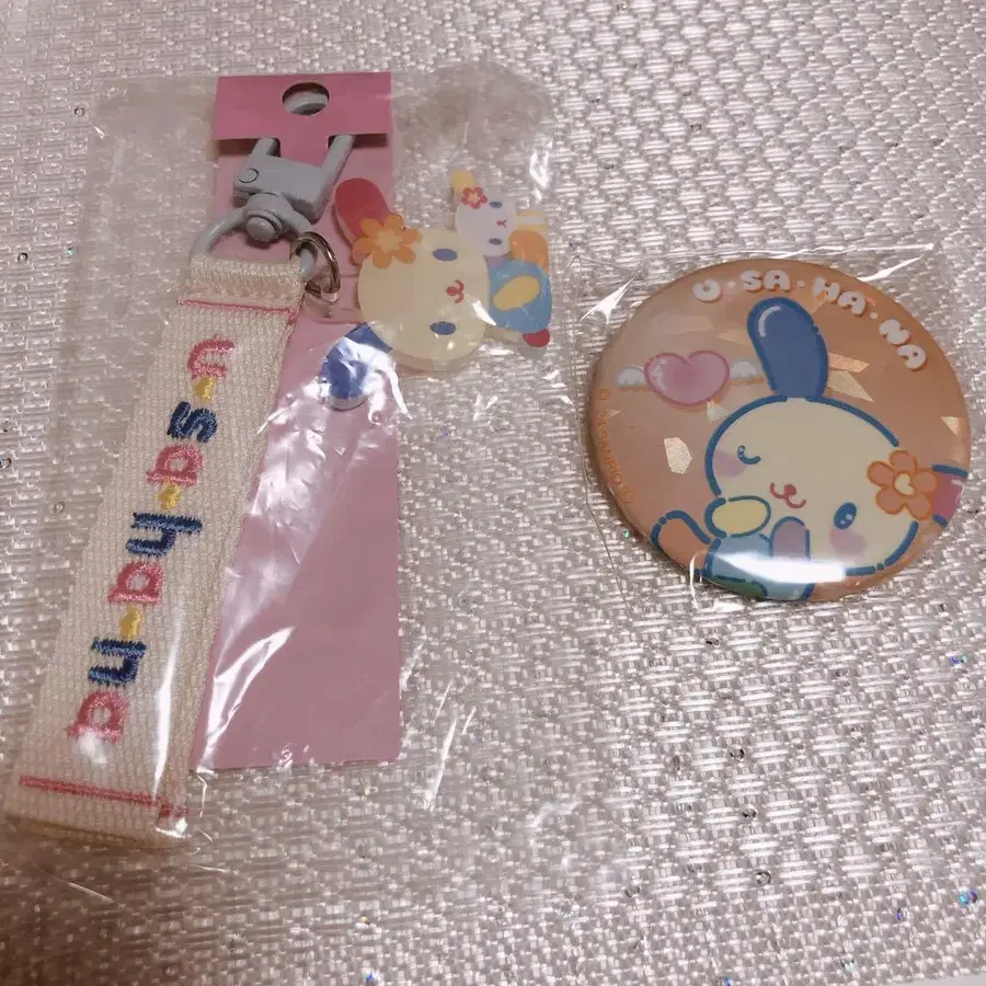 산리오 우사하나 로고 자수 키링 무뉴구루미 파티오 캔뱃지 캔뱃지는 내용물 확인을 위해 개봉했습니다. 둘 다 미사용입니다.