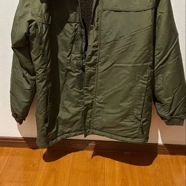 후드 부착 올리브 그린 다운 자켓, 안쪽은 플리스 소재로 보온성이 뛰어납니다. - 색상: 올리브 그린 - 디자인: 후드 부착, 지퍼 개폐 - 소재: 충전솜, 보온성 있음 - 특징: 안쪽에 플리스 소재 옷깃 방문해 주셔서 감사합니다.