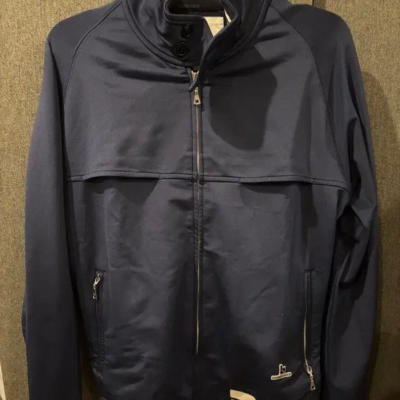 네이비 색상의 지퍼 재킷, 사이드 포켓이 있어 실용적입니다.