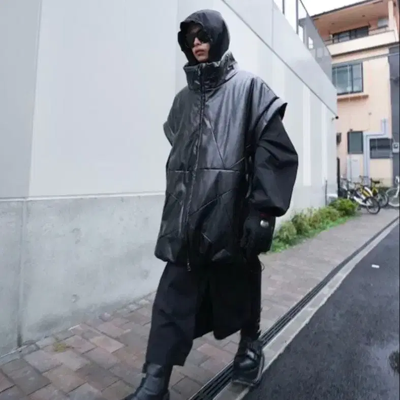 오버 사이즈 후드 부착 가죽 자켓, 블랙 컬러로 스타일리시한 디자인.