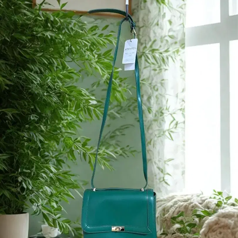 조정 가능한 스트랩과 골드 금장 장식이 특징인 그린 색상의 플랩 숄더백입니다. 새상품으로 구매하여 한 번도 사용하지 않았지만, 보관 중 약간의 형태 변형이 있습니다. - 색상: 그린 - 스트랩 길이: 조정 가능 - 금장 장식 색상: 골드