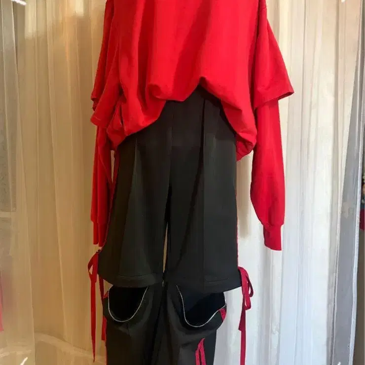 빨간색 후드 부착 맨투맨과 블랙 팬츠 세트.