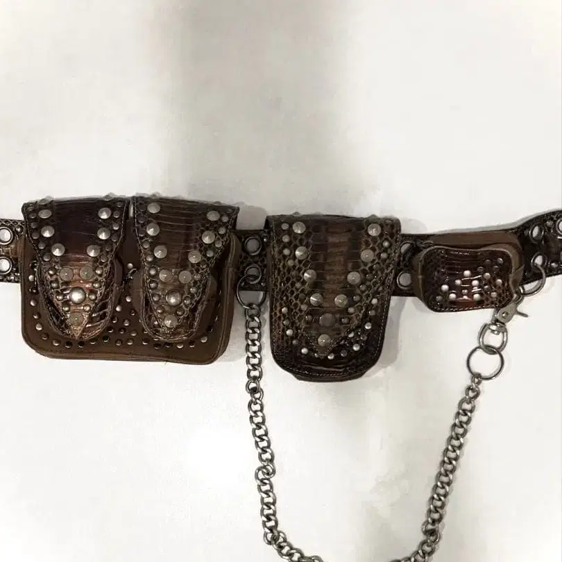 천연 가죽 웨스트 파우치 스터드 체인 펑크 웨스턴