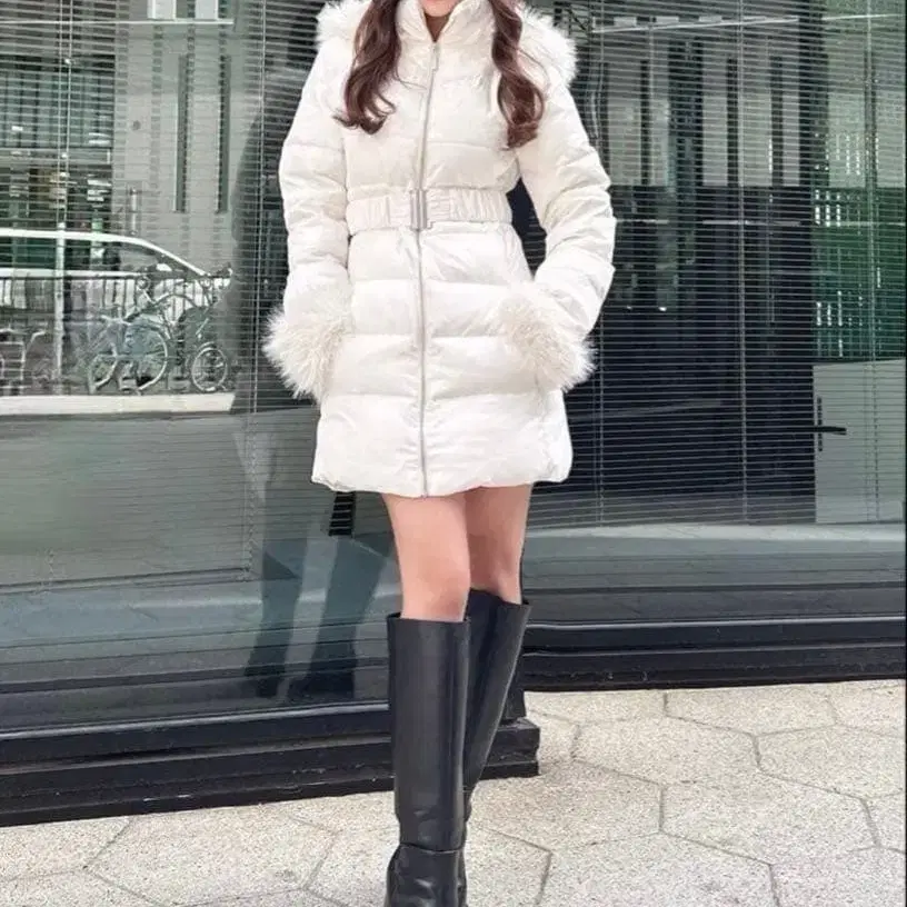 미셸 마카롱 미각 슬림 인조 모피 다운 코트 프리 사이즈 화이트