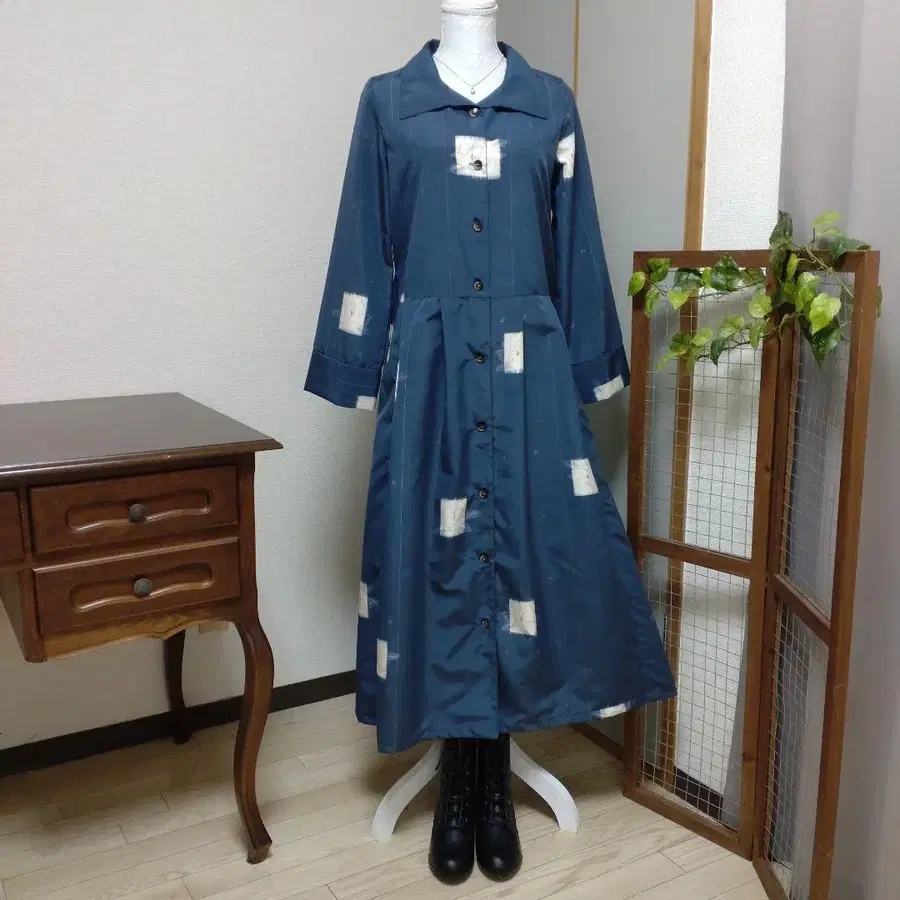 ✧ 언제나 방문해 주셔서 감사합니다 ✧ 순수 실크 紬의 미재단 옷감으로 코트 원피스를 만들었습니다. 스트라이프와 꽃 패턴이 은은한 광택을 내는 고급스러운 원단입니다. 버튼으로 열리기 때문에 코트나 원피스로도 활용 가능하며, 2WAY로 활약해 줄 상품입니다. 소매에는 커프스를 달았습니다. 뒷 허리에는 버튼으로 여미는 벨트가 있습니다. 마감이 좋은 추천 코트 원피스입니다. [ 상품 사이즈 ( 모두 평평하게 놓았을 때 사이즈 ) ] 어깨 너비 37cm 소매 길이 57cm 소매 17cm 가슴 너비 49cm 총길이 122cm 양쪽 사이드 심 포켓 앞 중심 열림, 의류용 버튼 여밈, 안감 없음 벨트 너비 8cm 길이 양쪽을 접어 37cm [판매 상품에 대하여] 이 상품은 미재단 옷감으로 제작했습니다. 오랫동안 보관했던 원단이므로, 빈티지 원단 사용 상품임을 이해하신 분의 구매를 기다립니다. 액세서리는 촬영용입니다.