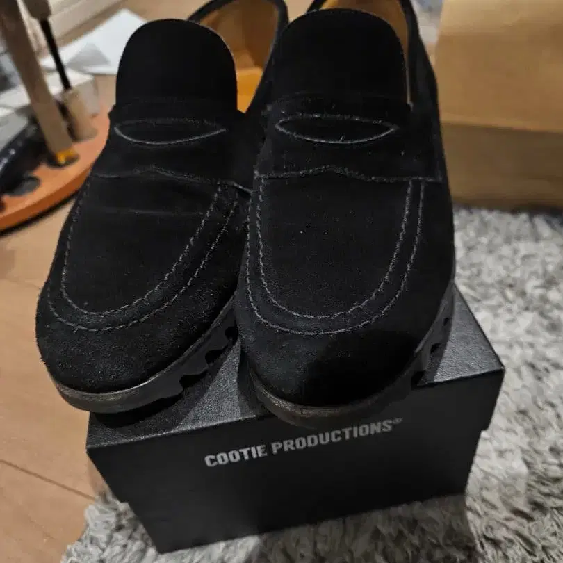 스웨이드 소재의 블랙 로퍼, 러버 솔로 쾌적한 착용감. - 브랜드: COOTIE PRODUCTIONS - 소재: 스웨이드 - 밑창 타입: 러버 솔 - 색상: 블랙 - 스타일: 로퍼 방문해 주셔서 감사합니다.