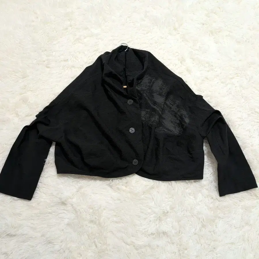검은색 숏 기장 겉옷, 버튼이 달린 스타일리시한 디자인.