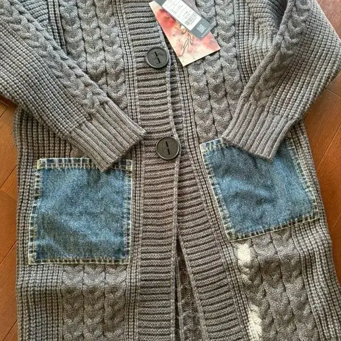 케이블 짜임 디자인의 그레이 니트 가디건, 데님 포켓 부착.