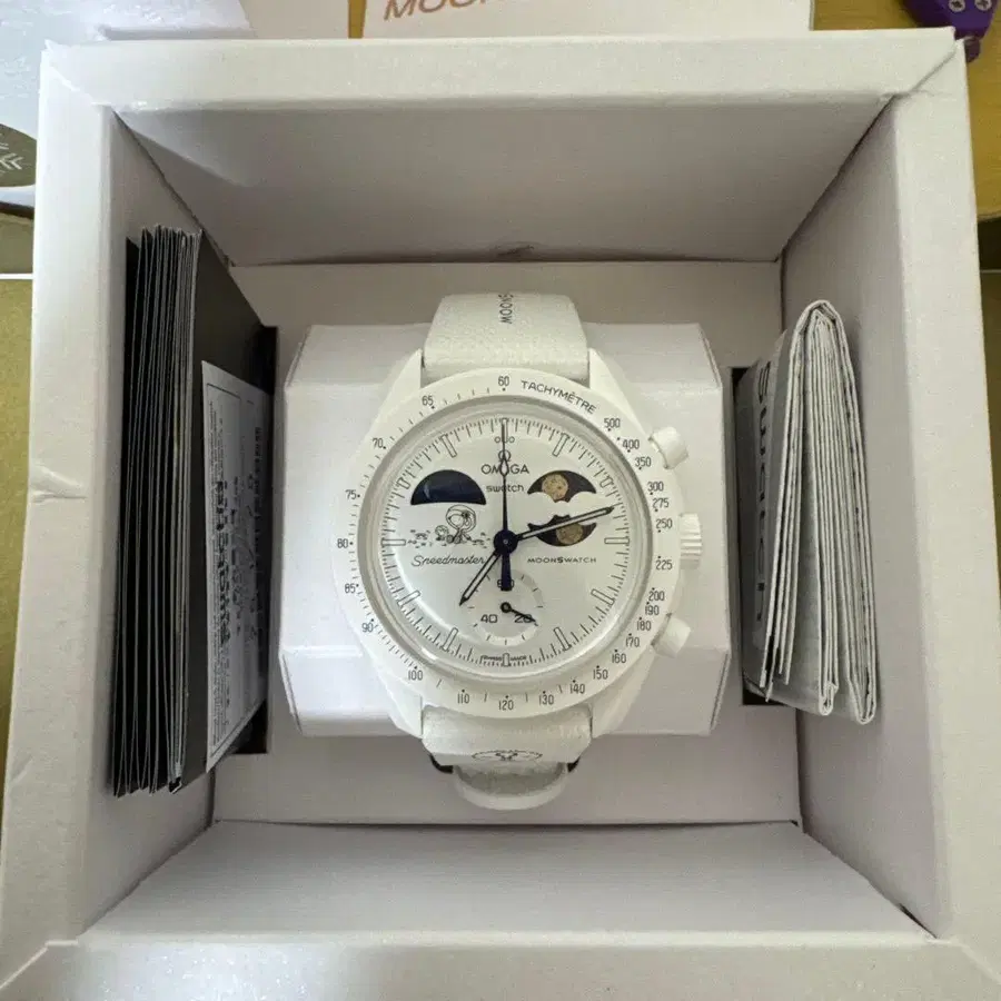 바이오 세라믹 소재의 화이트 색상 시계, 월상 표시 기능 포함.