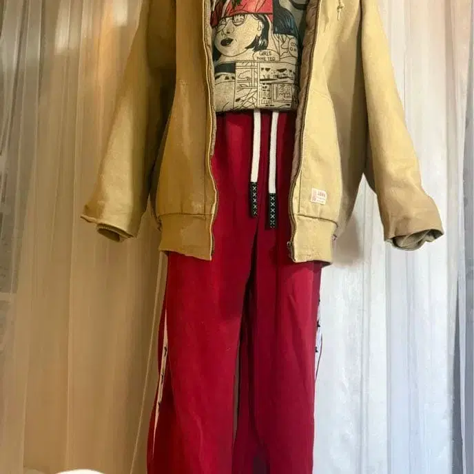 맨투맨 소재의 레드 조거 팬츠, 별 패턴의 사이드 라인 포함.