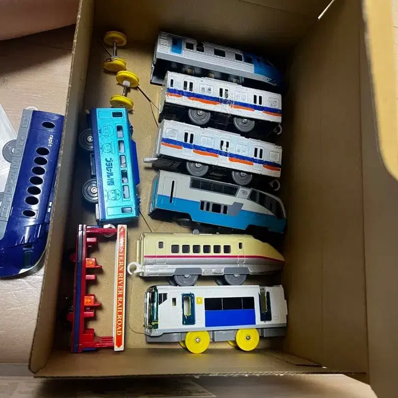 다양한 색상과 디자인의 프라레일 차량 세트.