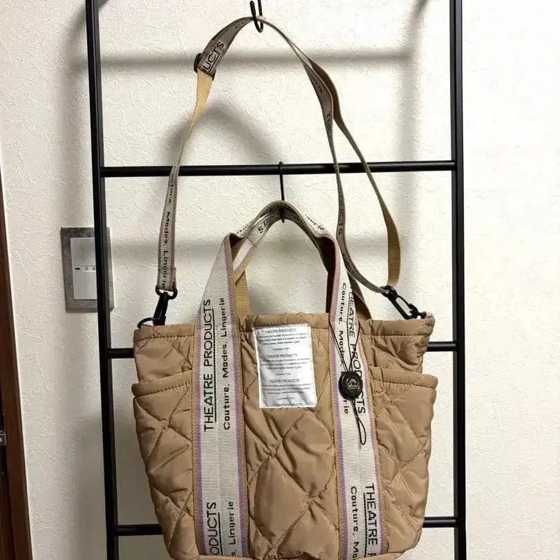 퀼팅 디자인의 베이지 토트백, 조정 가능한 숄더 스트랩 포함.